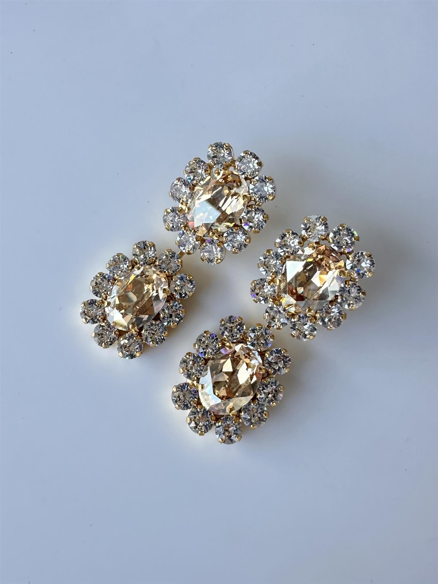 Store statement øredobber bestående av to like ledd med stor gylden beige sten i midten og klare stener rundt. Utrolig dekorative øredobber som pynter opp med en flott glans i stenene!
