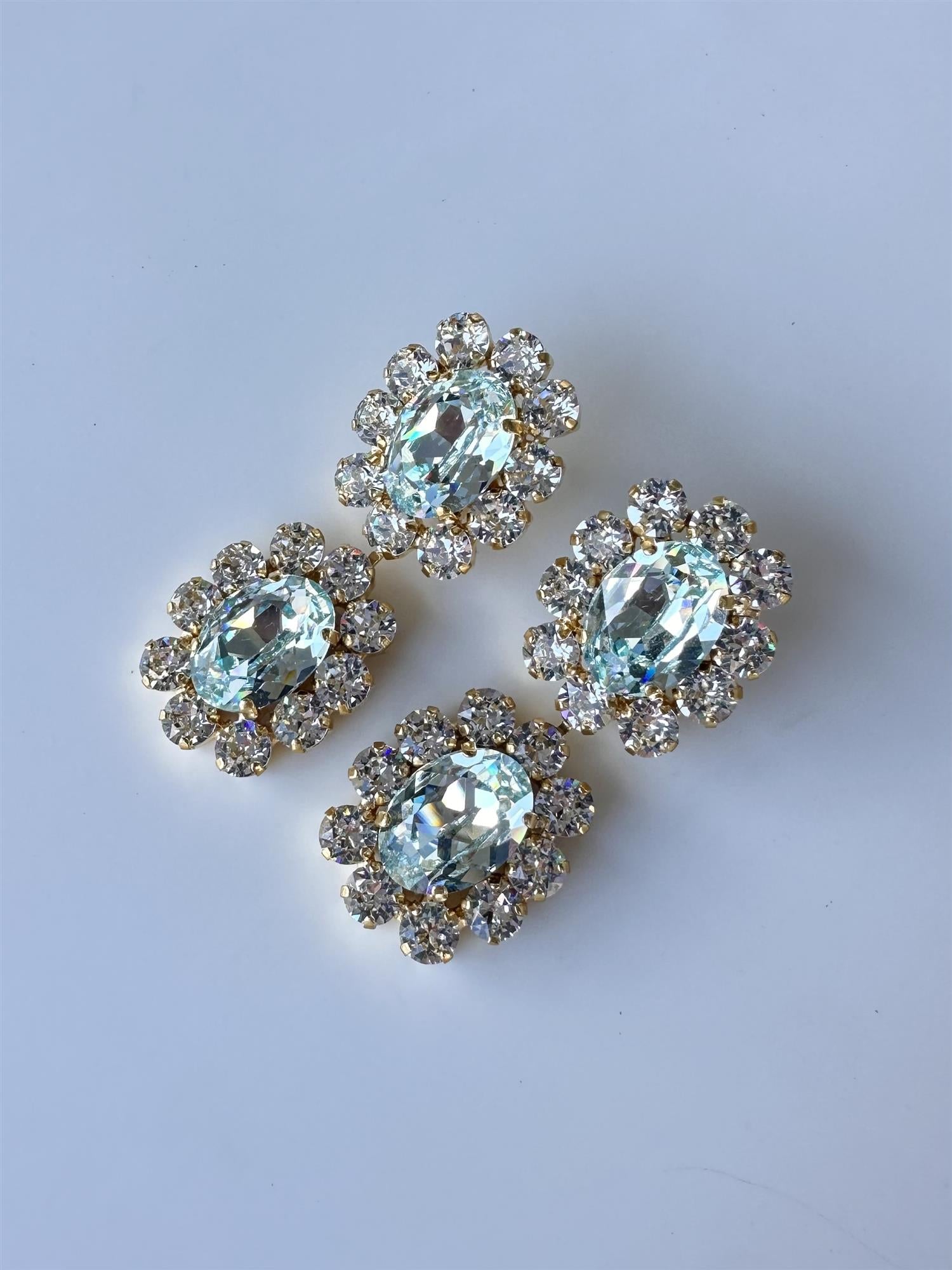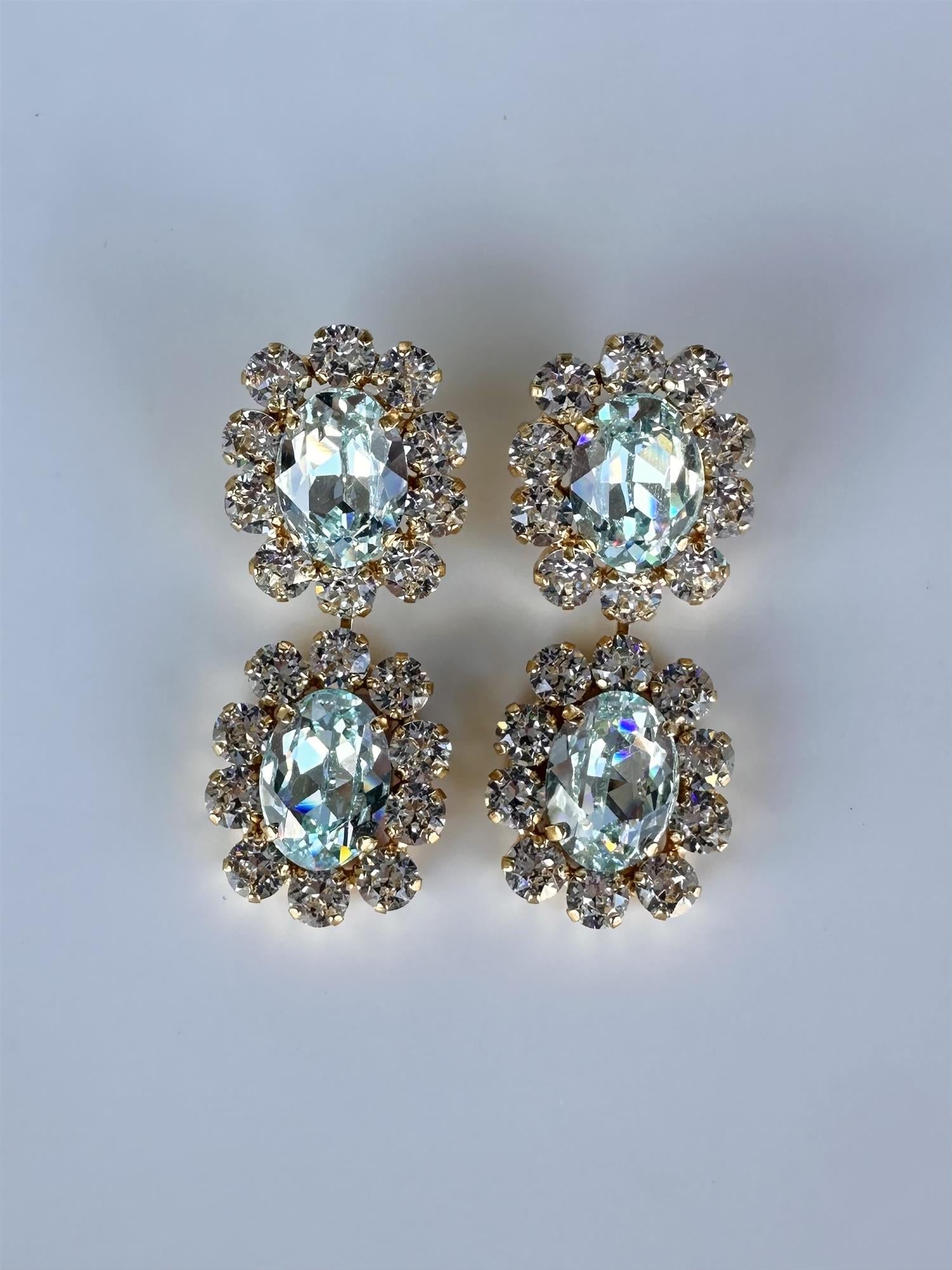 Store statement øredobber bestående av to like ledd med stor is-blå sten i midten og klare stener rundt. Utrolig dekorative øredobber som pynter opp med en flott glans i stenene!