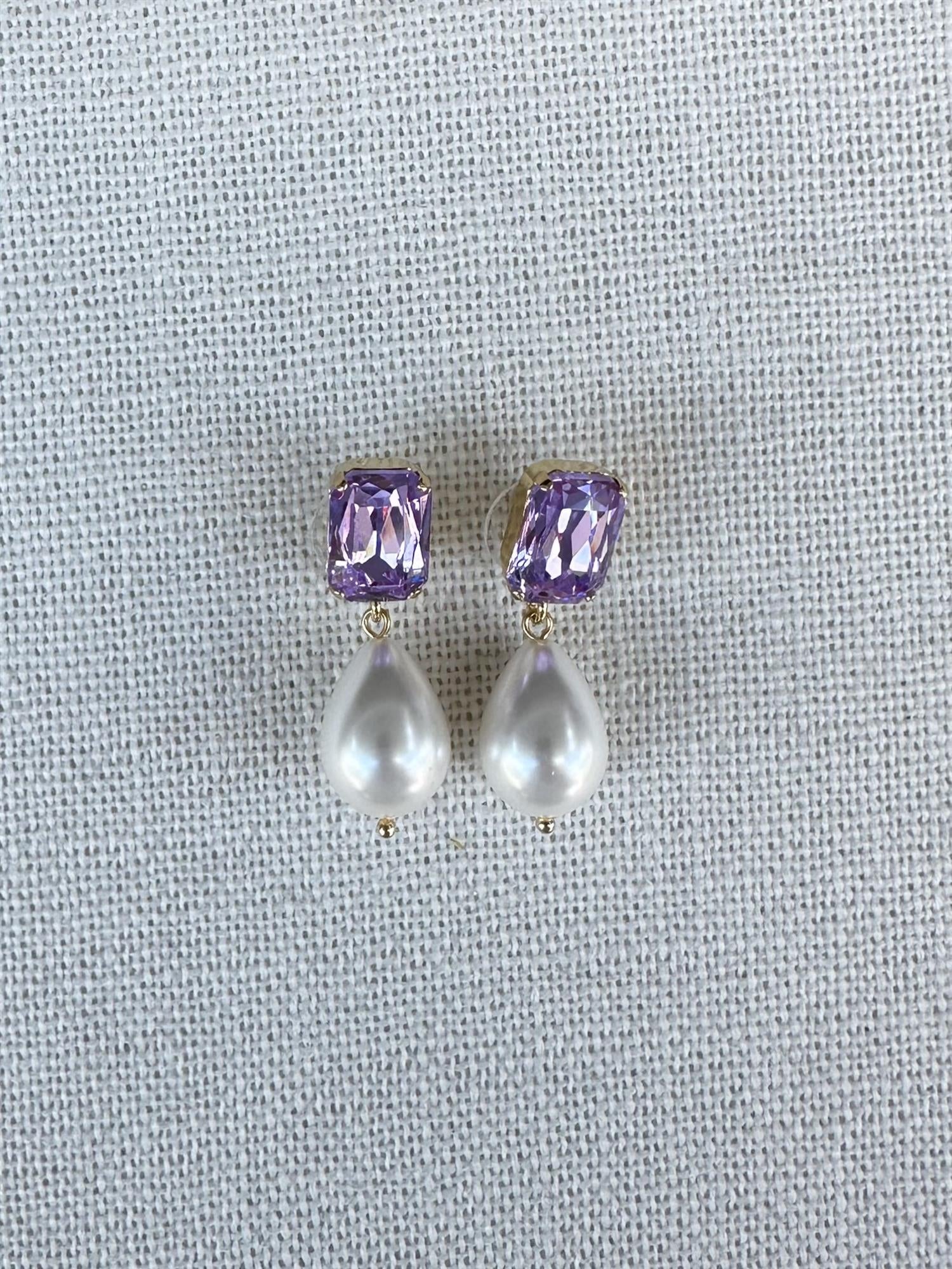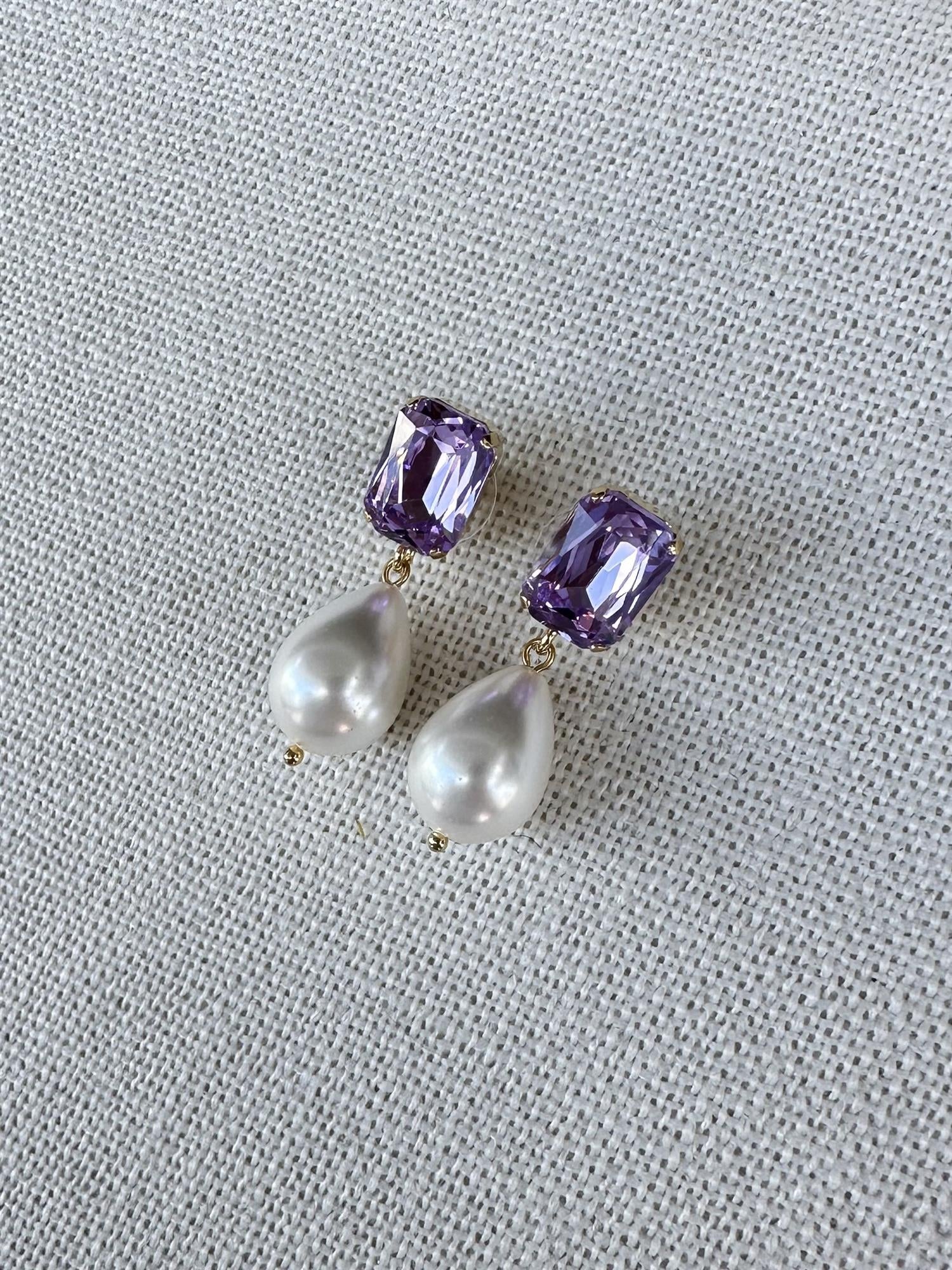 Vakre øredobber med rektangulær sten øverst og hengende perle. Stenen er i en nydelig lillafarge. Veldig dekorative og flotte øredobber som pynter opp uten å være tunge i ørene!