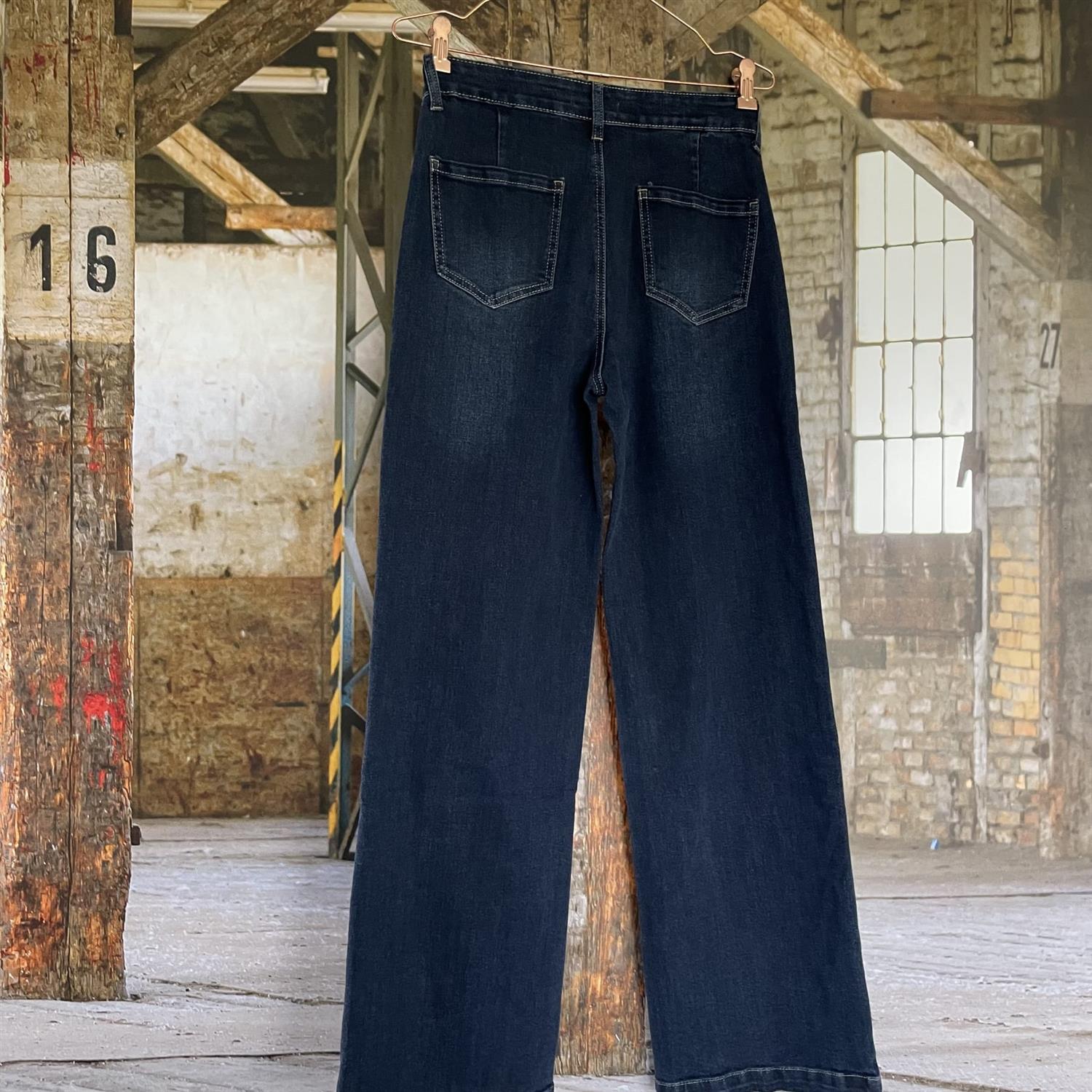 Jeans mørk denim med lommer i front og dekorative runde gullknapper i front