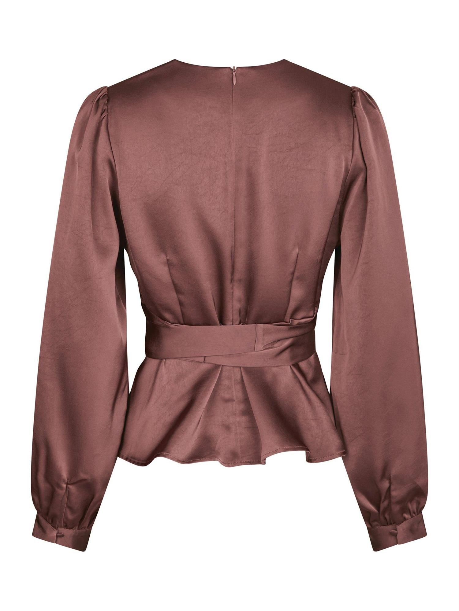 Feminin bluse i elegant satinkvalitet. Blusen har et bånd rundt midjen, som kan knytes foran eller bak.