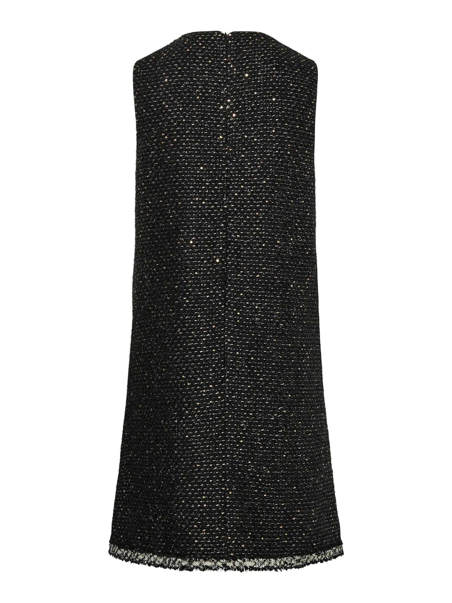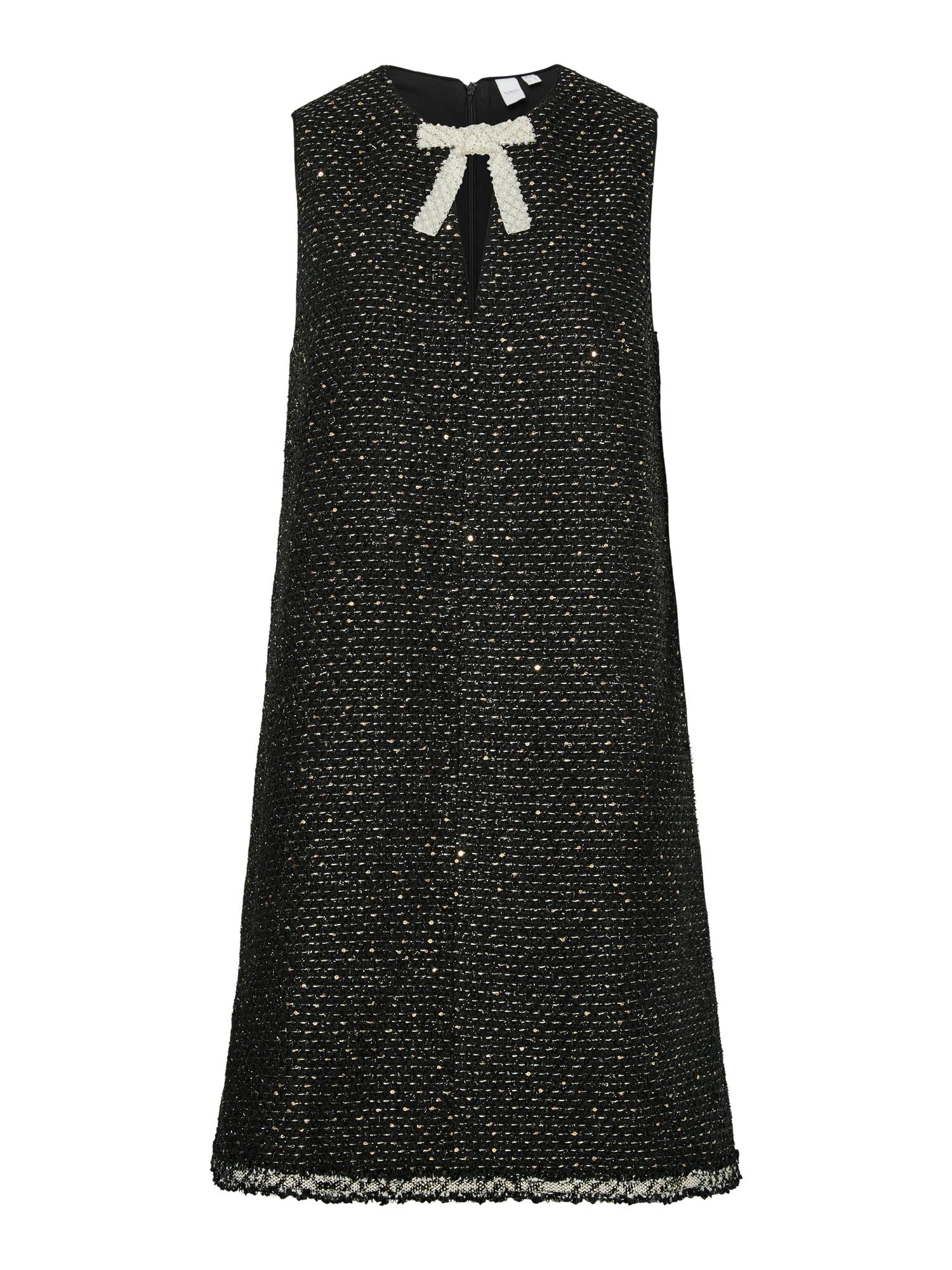 Lekker ermløs kjole i bouclé med paljettdetaljer. Utskjæring ved brystpartiet med dekorativ sløyfe med perler over. Glidelås åpning bak. Lekker med sort høyhalset inni også om man ønsker den mer tildekket.