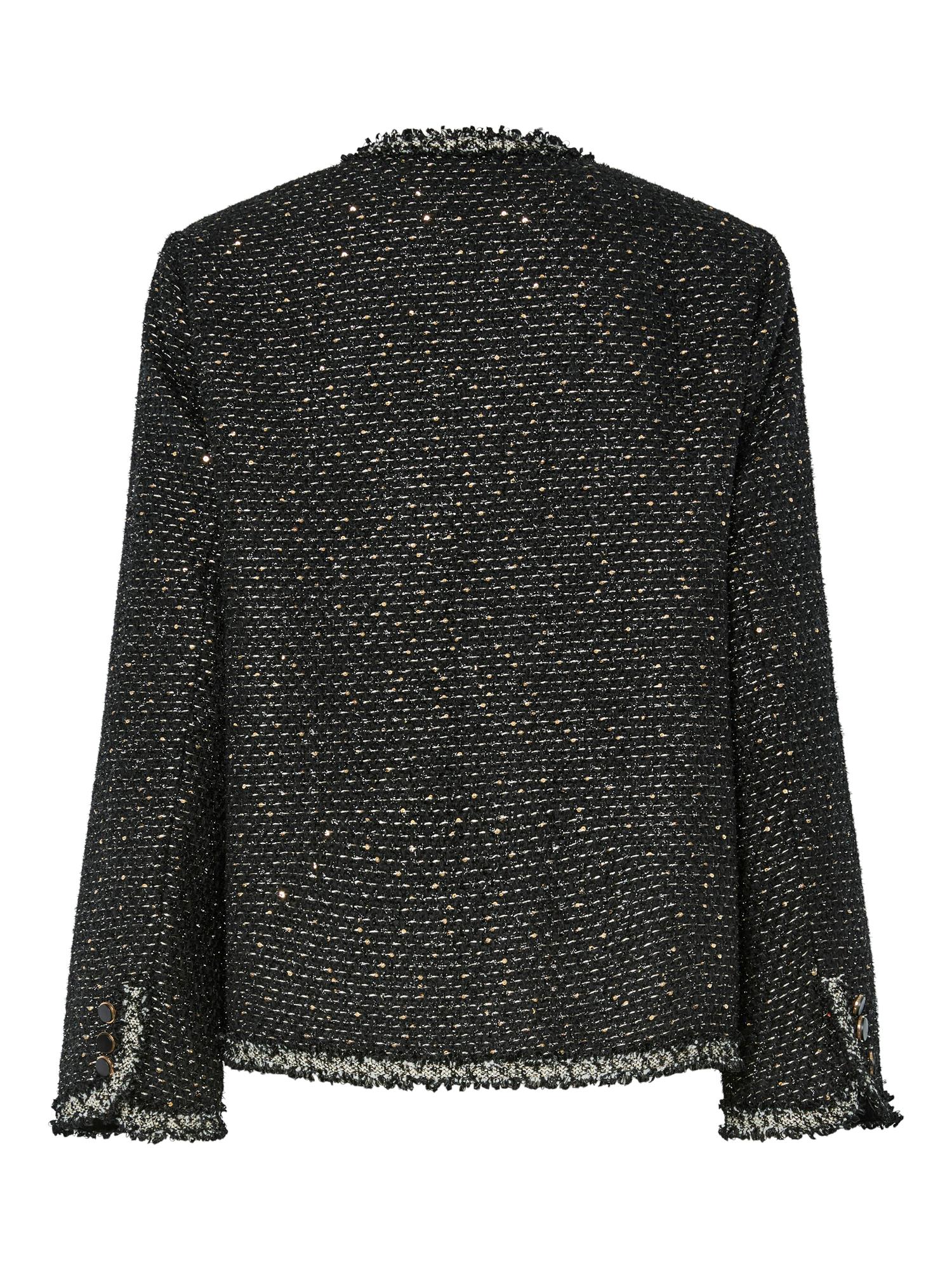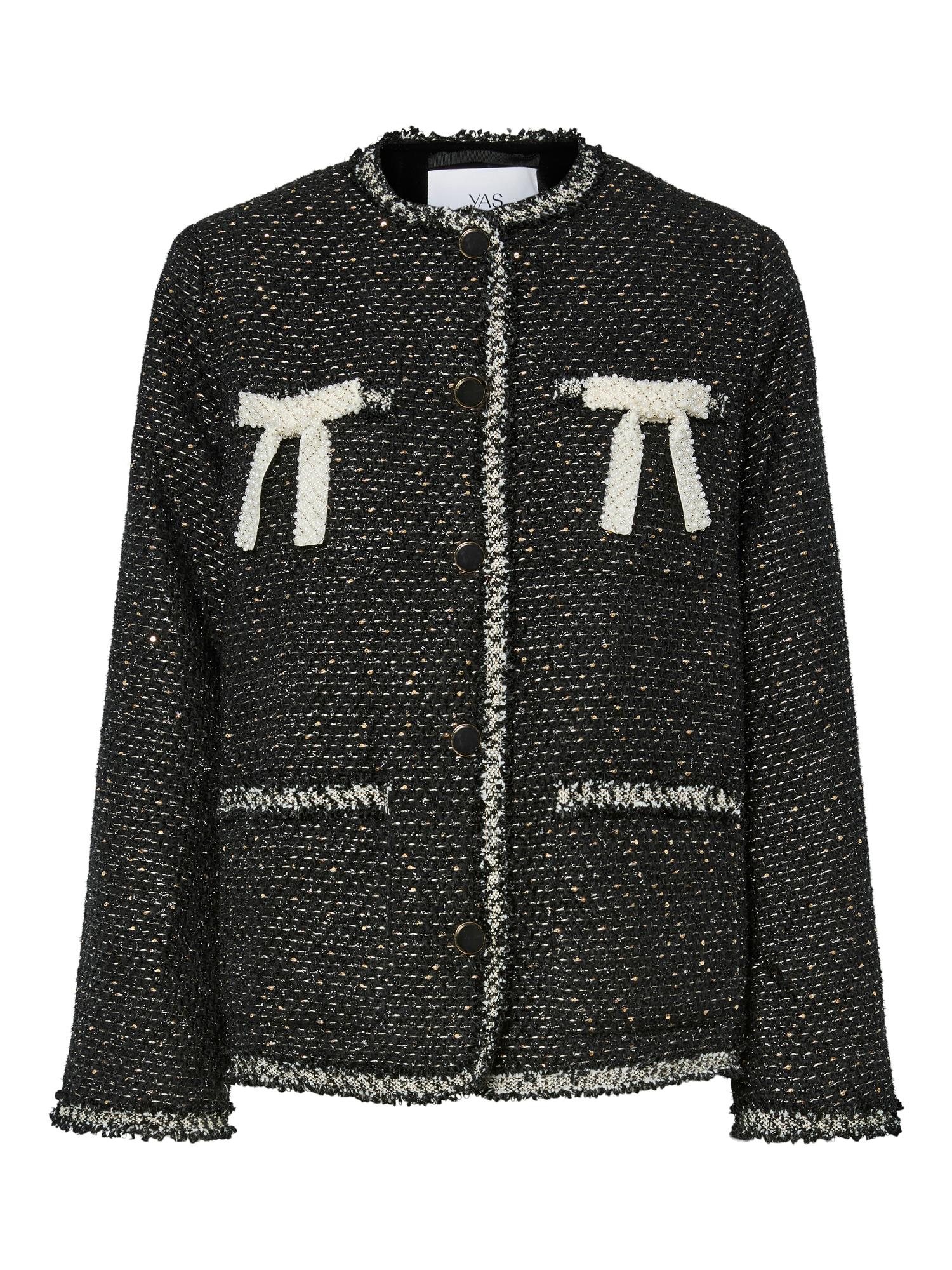 Lekker oversized tweed jakke med glitter. Det er dekorative sløyfer på brystlommene og lommer uten.